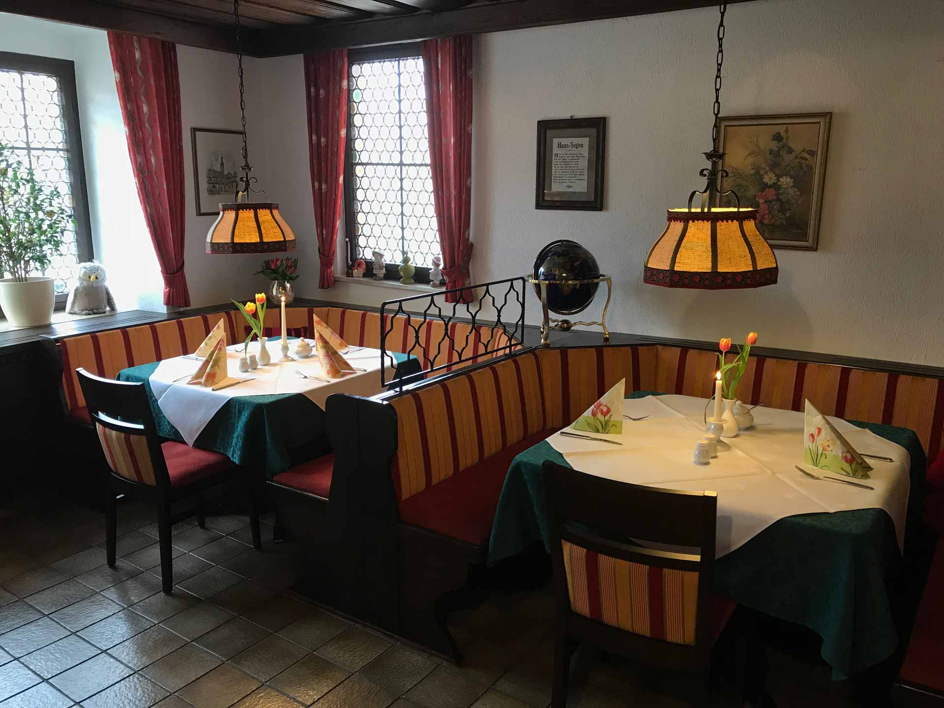 Unser gemütlich dekoriertes Restaurant verfügt über 50 Plätze. Dazu kommen in der warmen Jahreszeit noch 50 Plätze auf dem historischen Marktplatz.